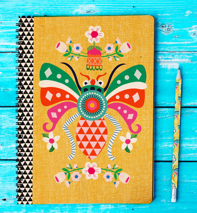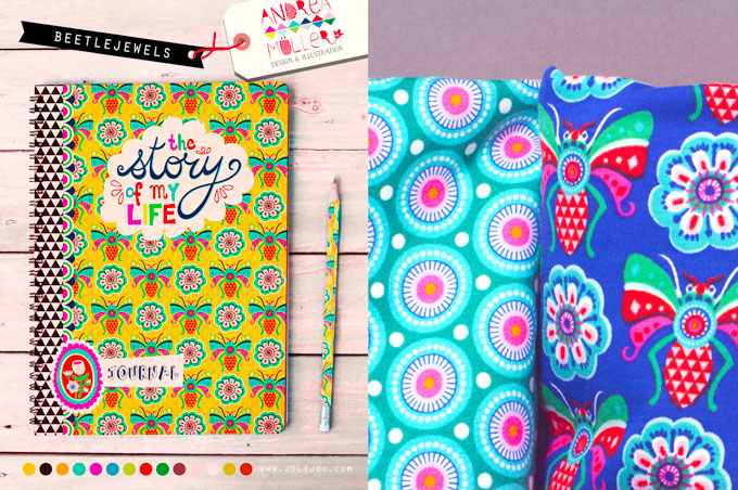 Die Aufgabe im Bootcamp hierfür war es, Edwardianische Broschen zu zeichnen und damit ein Schreibheft zu gestalten. Ich habe das Käferthema aus dieser Epoche aufgegriffen und eine opulente Brosche mit moderner Anmutung gezeichnet. Dieses Heft hier war einer der Versionen die ich für das Bootcamp entworfen habe und nun habe ich es passend zur Kollektion als Tagebuch drucken lassen und werde es ab Mitte September im Shop anbieten. Das andere Heft ist mit dem Schriftzug The Story of My Life ebenfalls als Tagebuch gedacht, hierfür habe ich die Käferbrosche mit einer Blumenbrosche kombiniert und das Cover vollflächig damit gestaltet. Das Muster bekam den Namen Beetlejewels in Anlehnung an den bekannten 80er Jahre Film Beetle Juice.