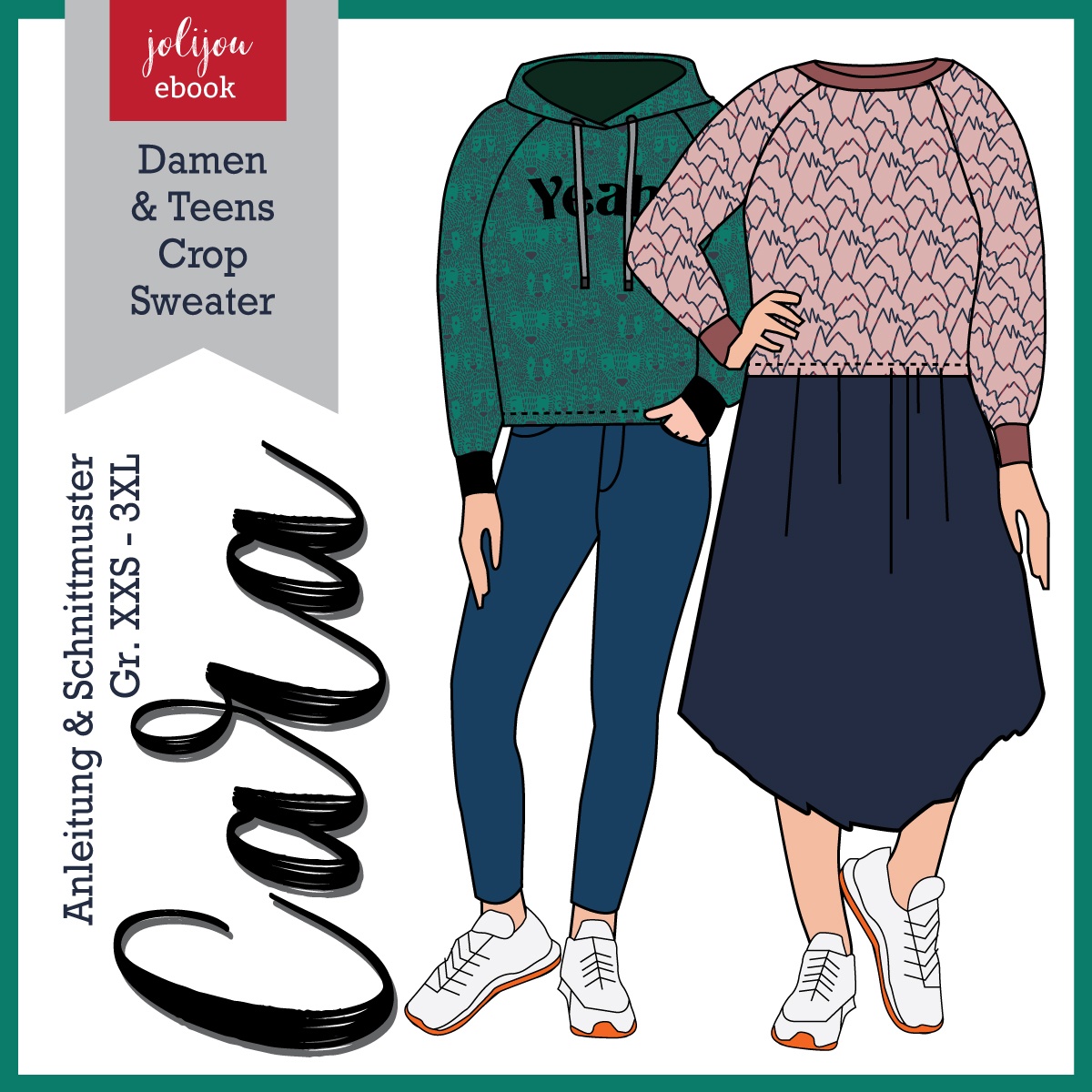 Darf ich vorstellen? Das ist unser neues Damen Ebook Schnittmuster, CARA. Cara ist ein trendy Sweater für Damen & Teens in angesagter Länge – ein sogenannter Crop-Sweater – und sieht nicht nur zur Hose, sondern auch zum Rock und über ein Kleid richtig süß aus. Dieser kurze Sweater Look ist gerade mega aktuell! Das Schnittmuster ist super einfach genäht und kann aus Sweat, Jacquard, Nicky oder Jersey genäht werden. Für alle die es gerne noch lässiger mögen haben wir eine optionale Kapuze mit integriert.