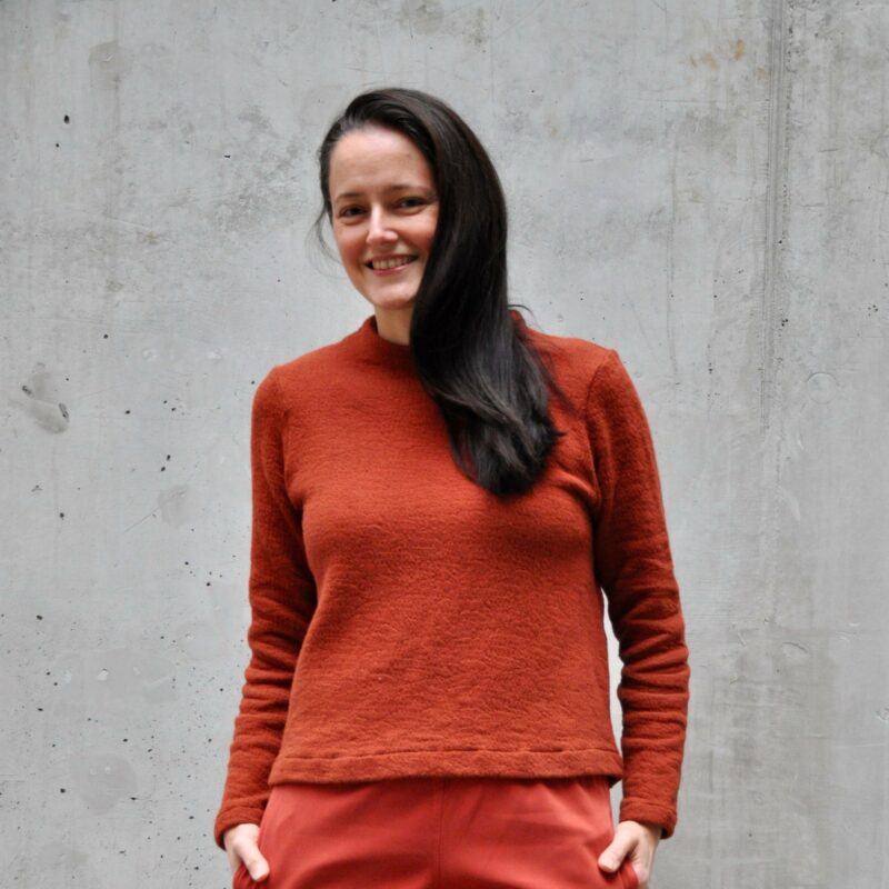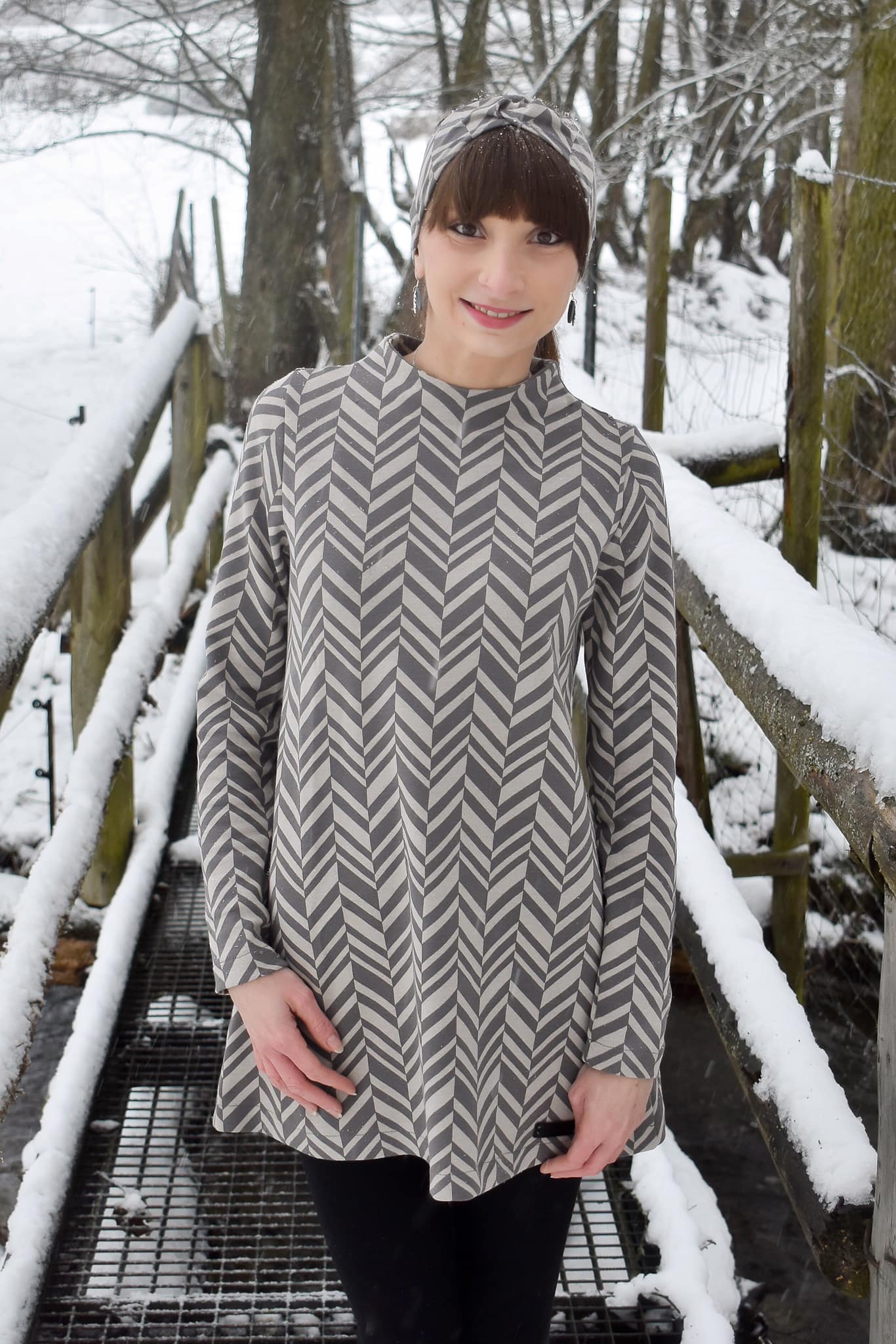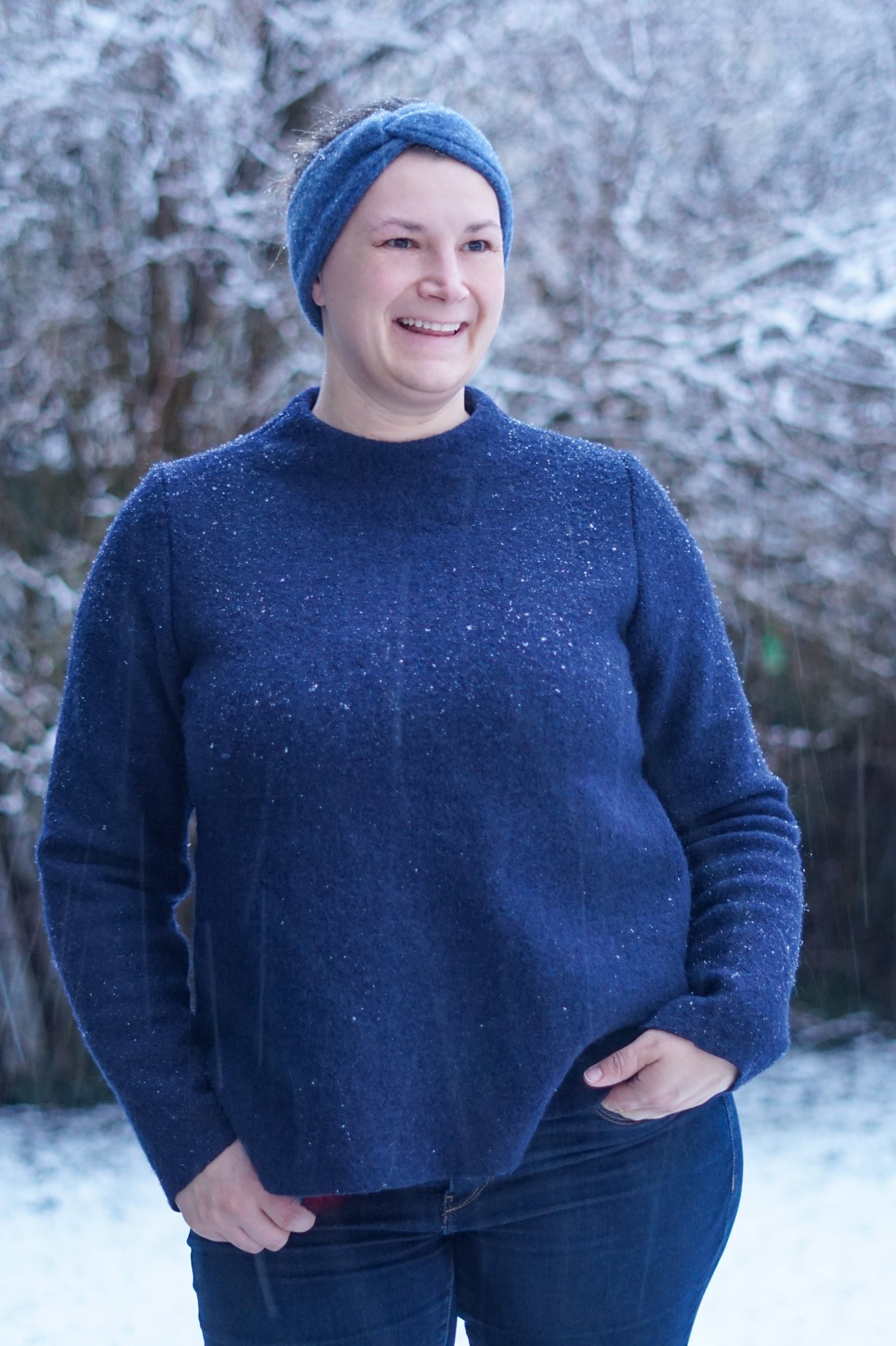 Tila kann in der Übergangszeit auch als Jackenersatz getragen werden wenn der Pullover aus dicker Wolle oder Filz genäht wird. Hier hat Minka ein ganz tolles Beispiel mit passendem Haarband genäht.