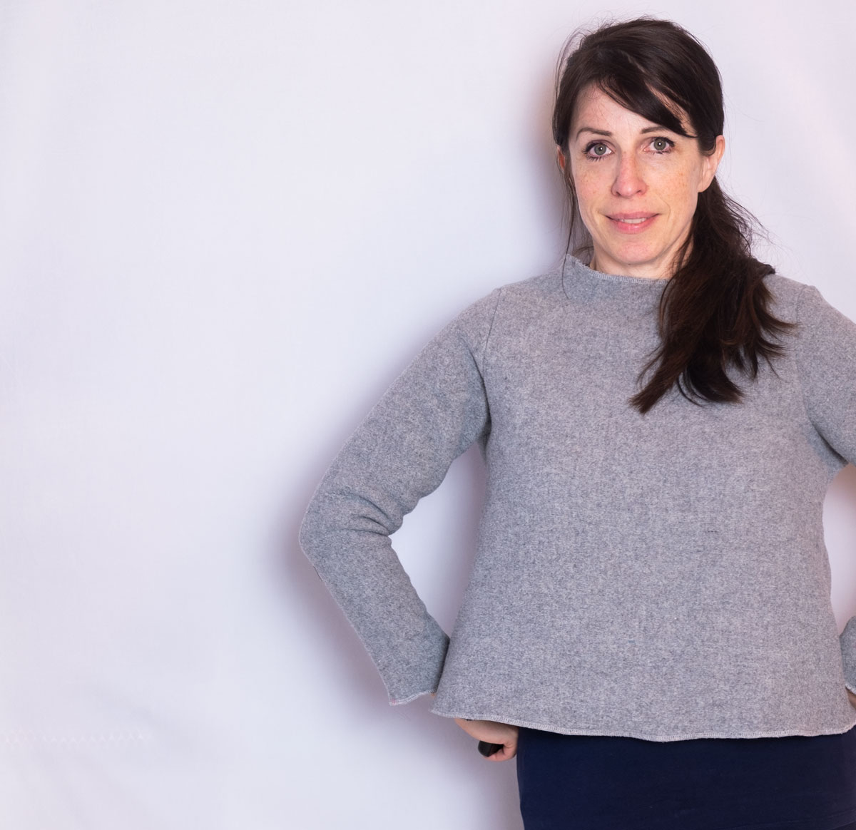 Dieses Beispiel wurde aus dickem grauem Wollfilz genäht und der Ausschnitt etwas breiter geschnitten. Die Kanten können wie hier entweder offenkantig mit einem Rollsaum versäubert werden …