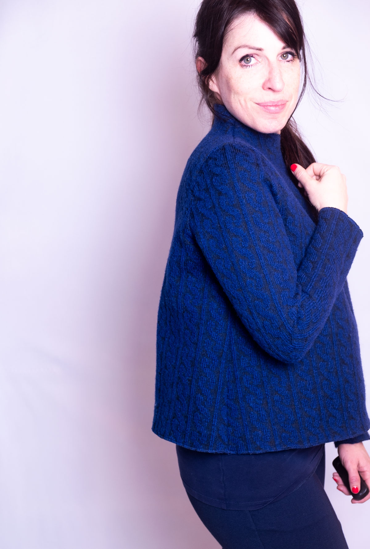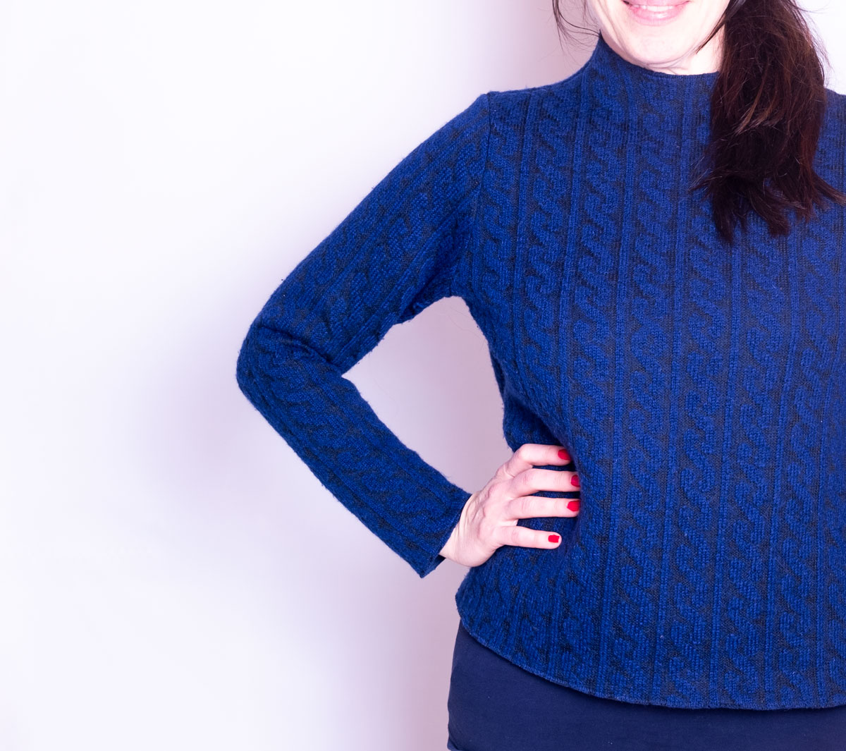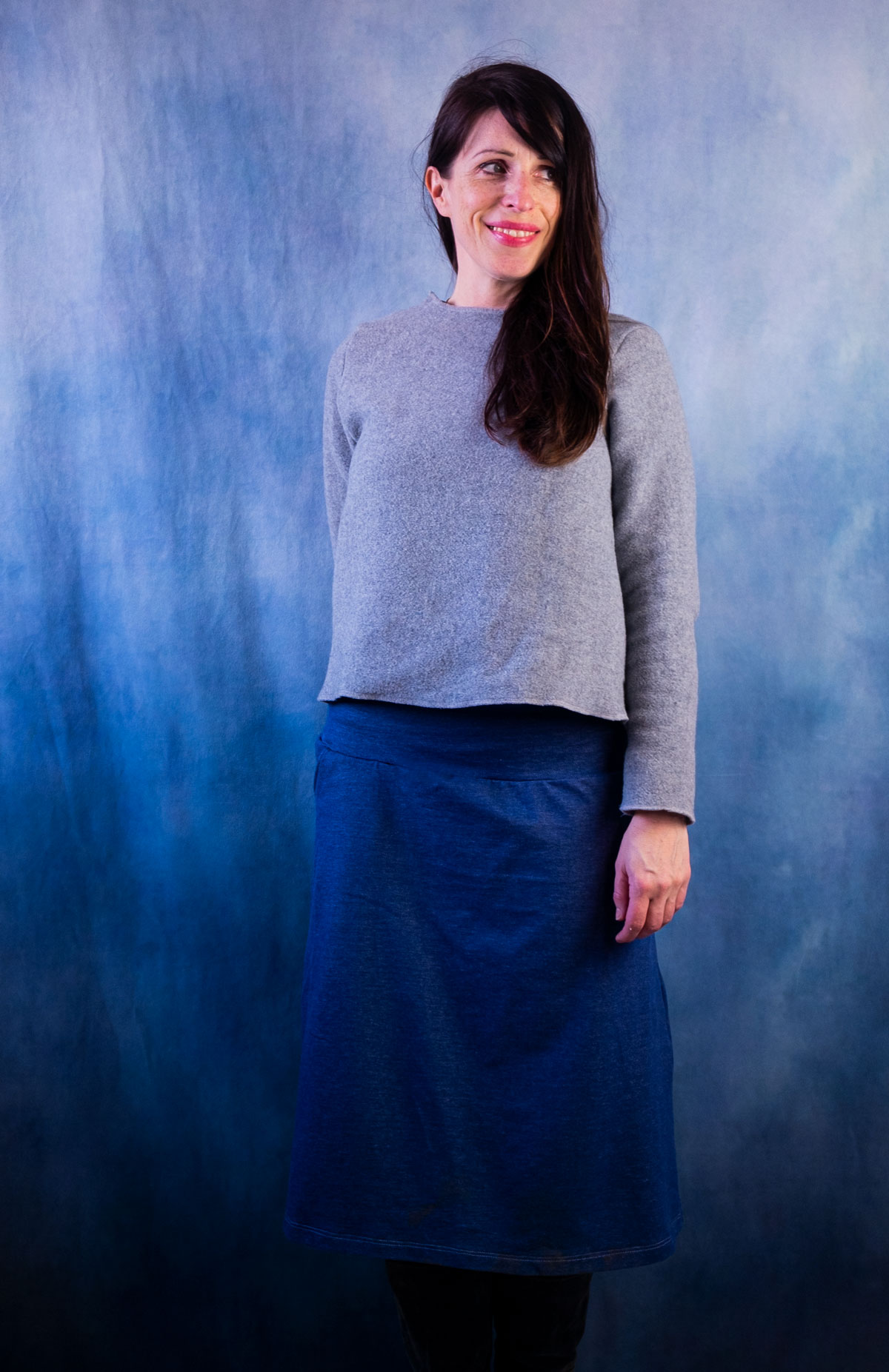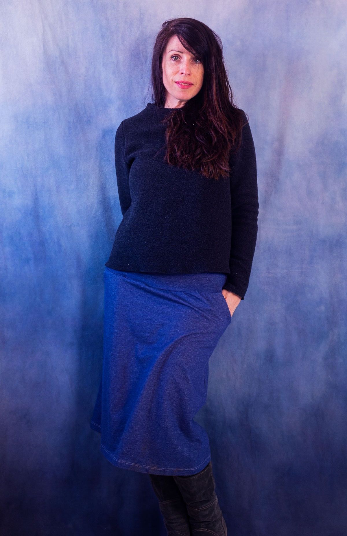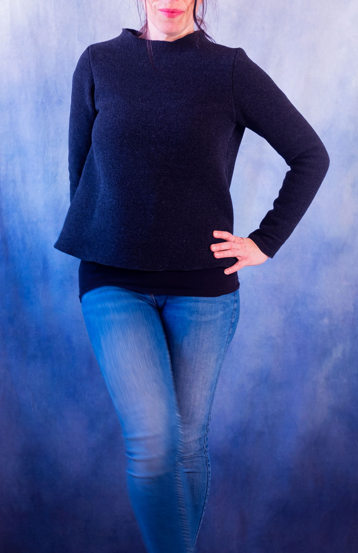 Hier als Pulli aus blauer Wolle mit Neopren-Rückseite, gab es mal bei Swafing im Angebot.