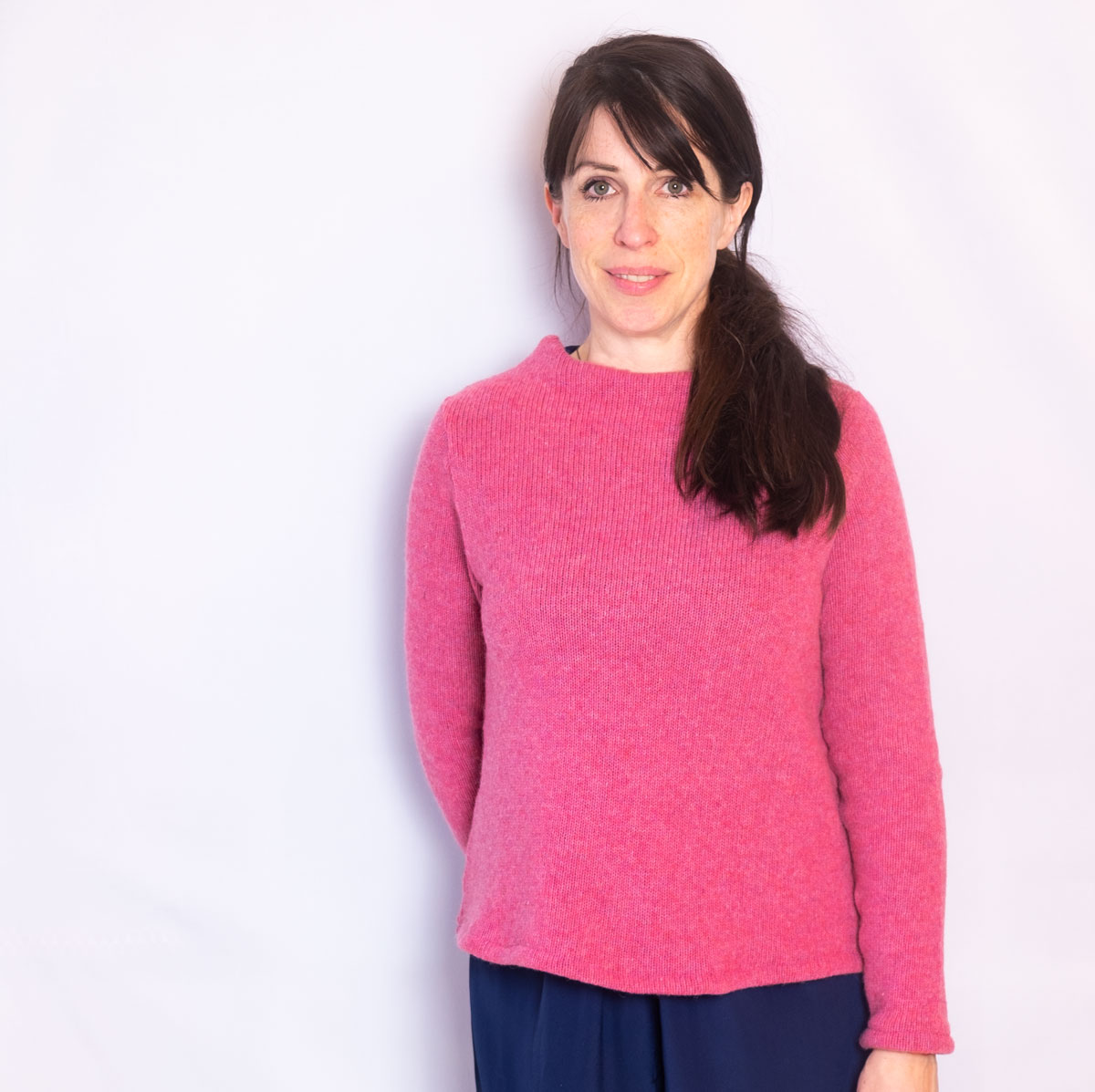 oder wie hier mit Beleg und umgenähten Säumen. Hier aus einem tollen Rosa Strickstroff von Swafing. Durch die A-Linie kann man Tila auch wunderbar zum Kleid oder zum Rock tragen.