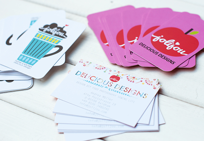 Dann natürlich das Allerwichtigste, die Visitenkarten. Ich habe mittlerweile eine kleine Auswahl an verschiedenen Designs. Hinten übrigens neuerdings mit QR-Code zum einfachen einscannen übers Handy. Angeber, I know!