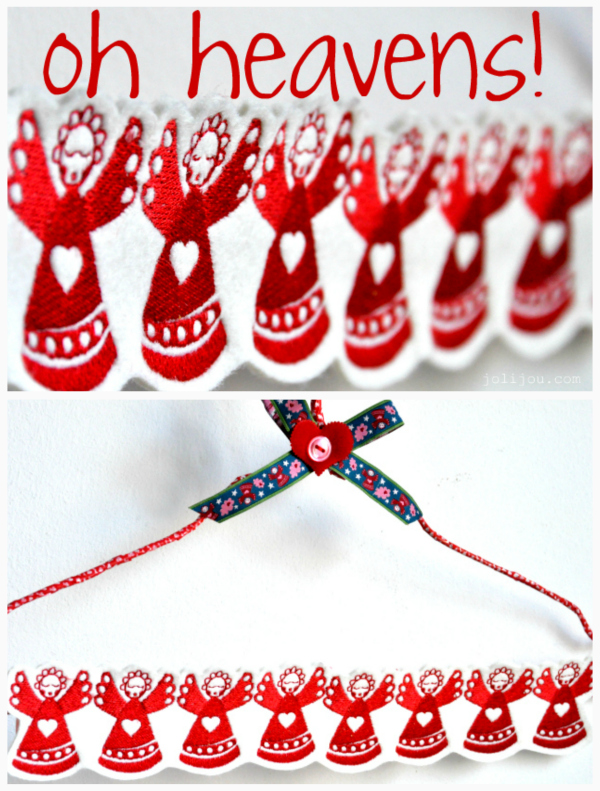 Quite a while ago, I designed these little angels and Jeanette of Huups digitalised them into gorgeous embroidery formats. Like this cute little edging pattern which is so nice for Christmas decorating – check out Sabine’s lovely cake tins! I’ll show you what I made with this half-finished, masking tape covered, clothes hanger soon….