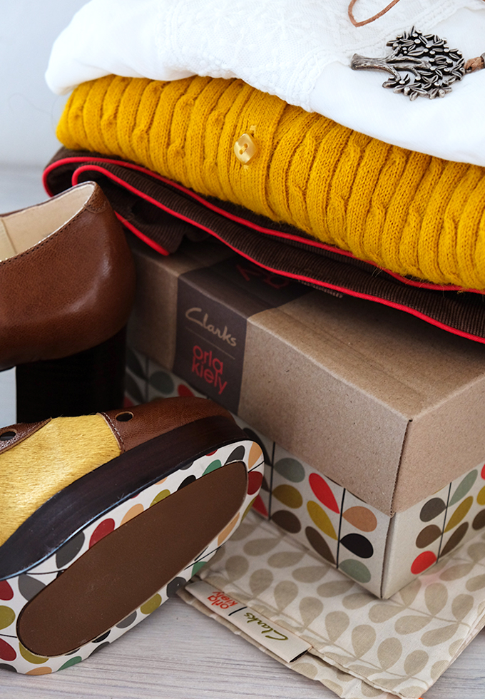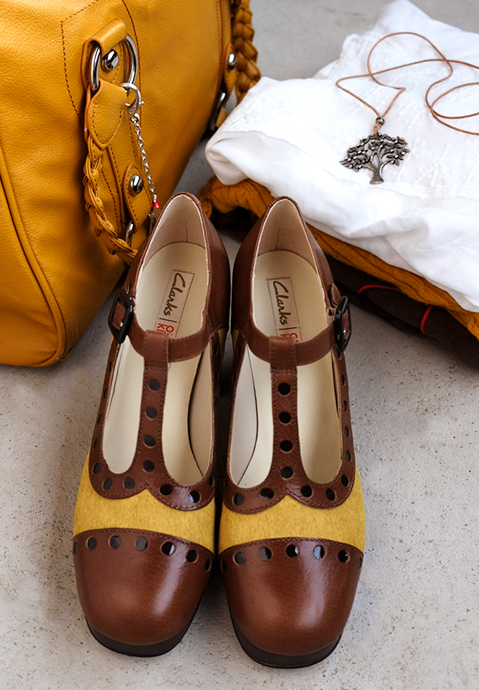 Nach der traurigen Geschichte von neulich und dem Verlust meines halben Kleiderschranks bin ich natürlich besonders froh über entsprechende Ersatz-Lieblingsstücke und daher freue ich mich sehr, dass ich heute Orla Kielys neue Schuh-Kollektion für Clarks präsentieren darf. Ich bin schon sehr lange ein Fan beider Marken. Orla wegen ihres trendy Retro-Stils und Clarks für seinen hochwertigen very british Stlye. Dass diese nun zusammenarbeiten, um uns coole Vintage-Schuhe in hochwertiger Markenqualität zu bieten finde ich großartig. Das finde offensichtlich nicht nur ich, denn die erste Orla Kiely Schuh-Kollektion war überall sehr schnell ausverkauft und ich bin mir sicher auch ihre zweite Kollektion wird wieder heiß begehrt sein. Zum Glück konnte ich mir schon ein Paar ergattern aber bei der Auswahl fiel die Entscheidung zwischen, Mary-Jane Plateauschuhe, coole Boots oder klassische Stiefeletten ziemlich schwer. Letztendlich war ich mutig und habe mir die Orla Dotty in Mustard ausgesucht denn die Farben passen prima zu meinem Vintage-Outfit aus Amy-Rock in Braun und senfgelber Strickjacke.