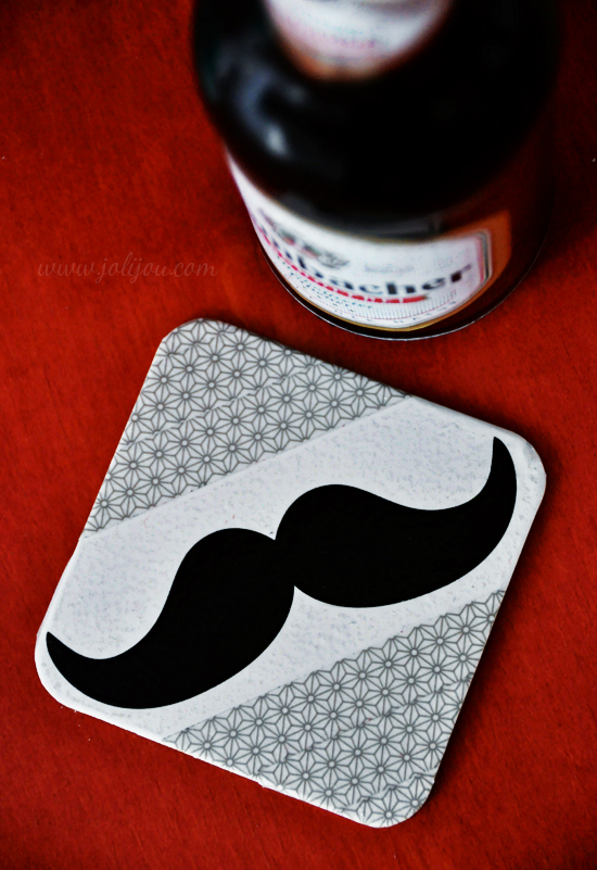 Und für den Herren der Schöpfung gibt es dank Masking Tape und Schnurri-Klebeband natürlich auch passende Untersetzer…(ich habe die Oberseite mit Lack beschichtet, damit das Klebeband nicht abgeht) …