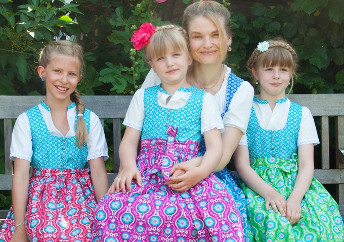 Dank auch an Gisi und ihre drei zauberhaften Töchter! Ich bin total verliebt. Und Gisi war ebenfalls super fleißig und hat gleich vier Dirndl inklusive Blusen genäht! Die Blusen hat sie vorne offen gelassen und den Kragen passend zum Dirndloberteil mit Little Blossom eingefasst. Jedes Dirndl hat eine andere Schürzenfarbe aus Poppy Go Lucky bekommen.