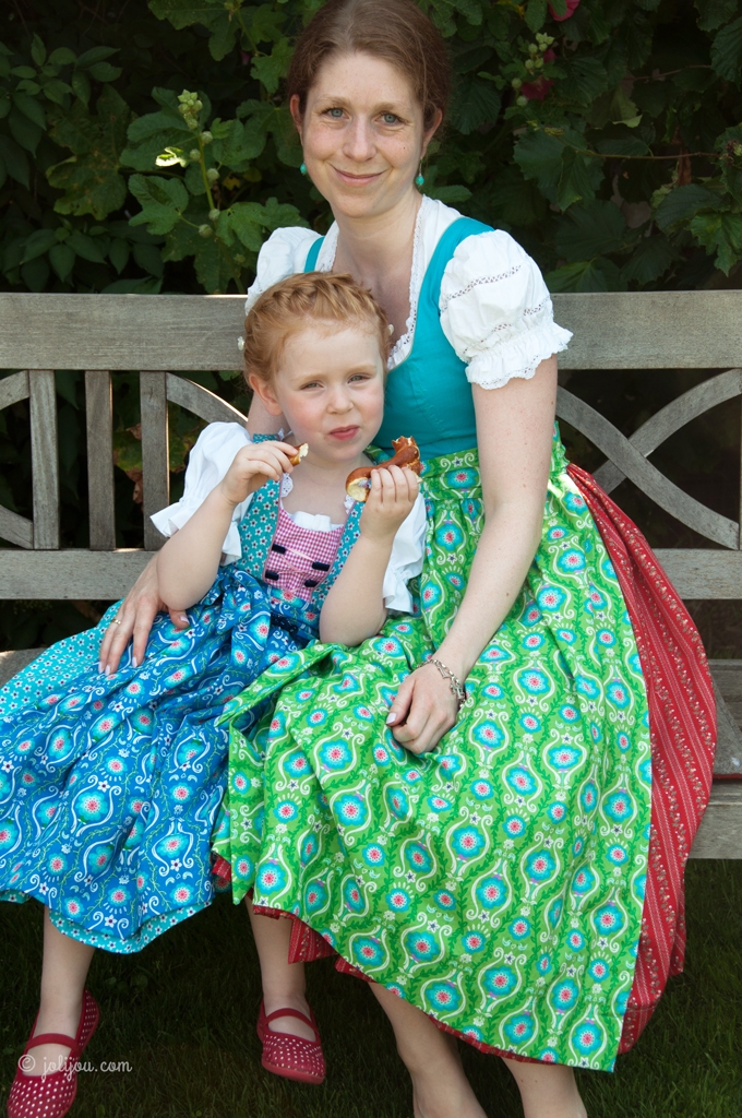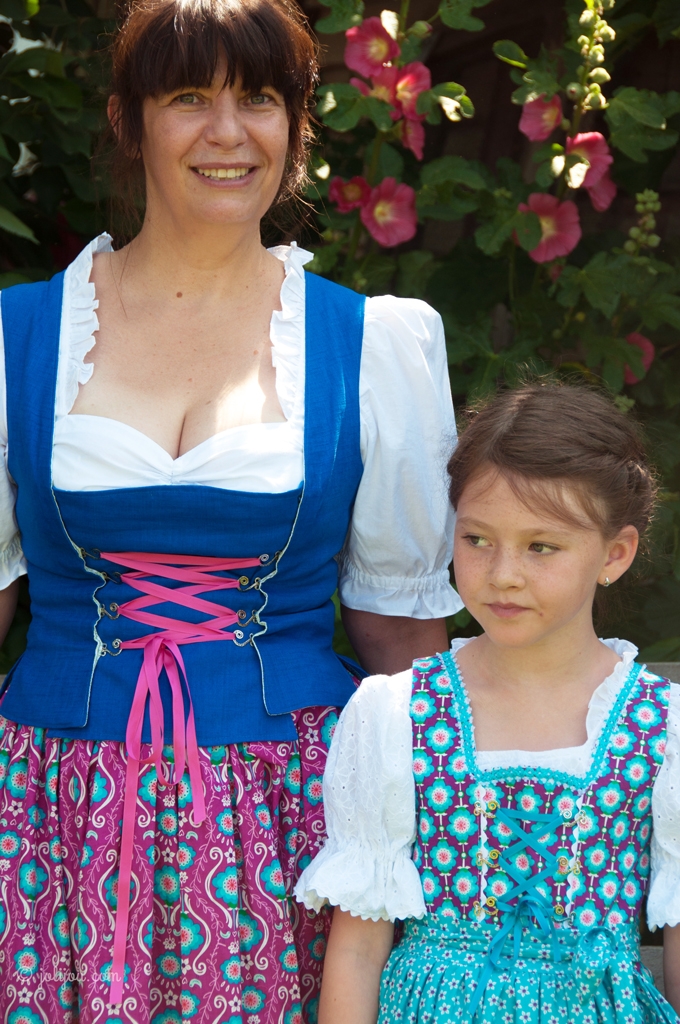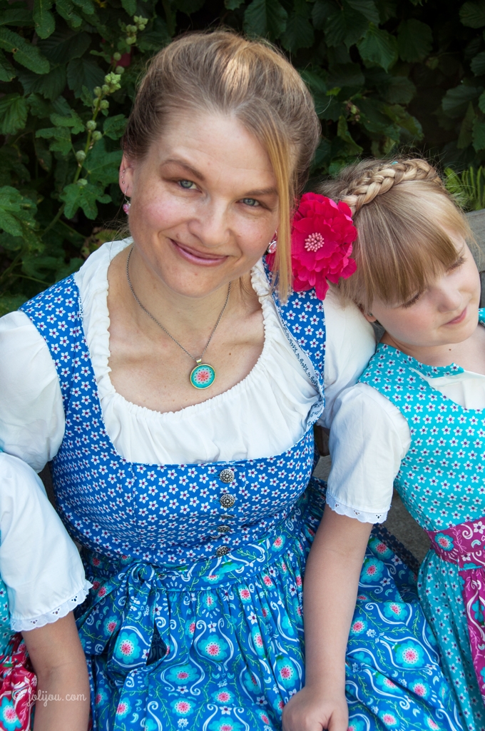 Danke an Carmen, hier mit ihrer supersüssen Tochter, die so schöne Frisuren gezaubert hat! Sie trägt ein Dirndl aus türkiser Seide mit grüner Poppy Go Lucky Schürze. Das Dirndl ihrer Tochter ist aus blauem Little Blossom und mit einer Schürze aus blauem Poppy Go Lucky.