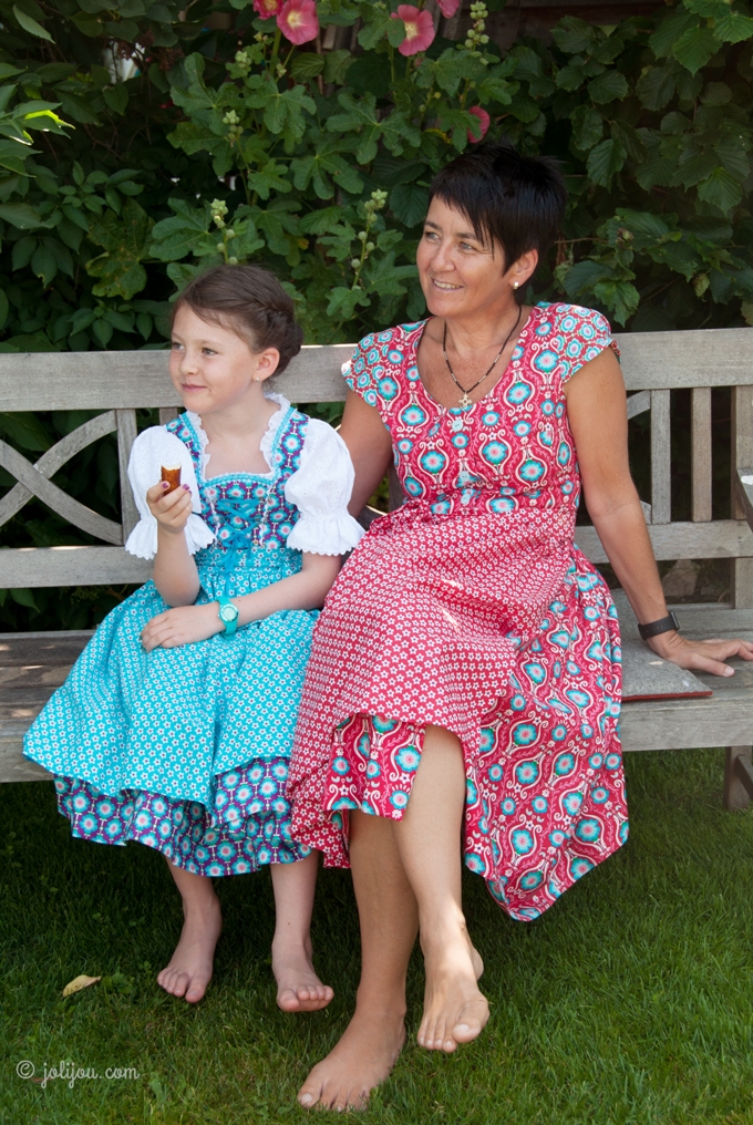 Caros Dirndl ist aus Poppy Parade und Popy Go Lucky in Lila genäht. Die Dirndl ihrer Töchter sind aus Little Blossom Türkis und Poppy Parade Blau. Weitere Informationen zu Caros Dirndl und die ihrer süssen Töchter könnt ihr in ihrem Blog Carohonk nachlesen.