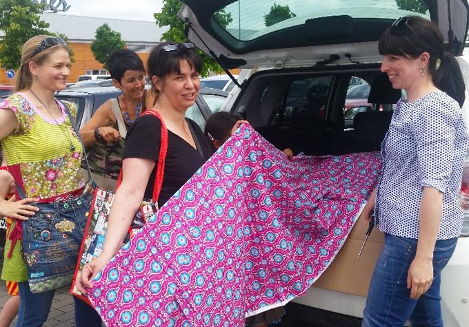 Also gut, da wir uns ja spätestens seit vorgestern nun alle einig darüber sind, unsere Dirndl künftig selber zu nähen 😉 möchte ich euch heute etwas mehr über die Dirndl berichten die für das gemeinsame Projekt mit Mondbresal entstanden sind. Gestern erzählte ich euch ja schon, dass ich bereits beim Zeichnen die Vision von selbst genähten Dirndl vor Augen hatte, deshalb sind diese Fotos für mich auch eine ganz besondere Augenweide, denn Träumen kann man ja, aber dass der Traum am Ende so grandios in Szene gesetzt wird, das schafft man nur mit ganz viel tatkräftiger Unterstützung! Manchmal ist es so im Leben, dass alles einfach zusammen passt, denn als ich Renate anschrieb und fragte ob sie Lust hätte, mit meinen Stoffen und ihrem Dirndl-Ebook eine gemeinsame Aktion zu starten, erzählte sie mir, dass sie ohnehin an einem neuen Dirndl-Schnittmuster säße und es daher perfekt passen würde. Renate trommelte in kürzester Zeit eine tolle Truppe für das Projekt zusammen, ich bin immer noch total gerührt wie schnell alle zusagten, und so trafen sich einige von uns kurze Zeit später eines Sonntags auf dem Parkplatz vom Münchner Stoffmarkt zur konspirativen Stoffverteilung. Sehr lustig auch die neugierigen Blicke der anderen Stoffmarktgänger.
