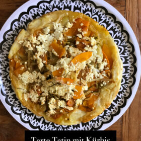 Tarte Tatin kommt aus Paris und wird klassischerweise als süsse Nachspeise mit Äpfeln gebacken und ich habe sie schon mehrfach selbst gemacht. Als ich neulich Bines Birnen-Abwandlung gesehen habe hatte ich eine spontane Eingebung für eine herzhafte Variante mit Kürbis. Mmmh und statt Karamell würde ich den Kürbis mit Ahornsirup, Zwiebel und Feta verfeinern.