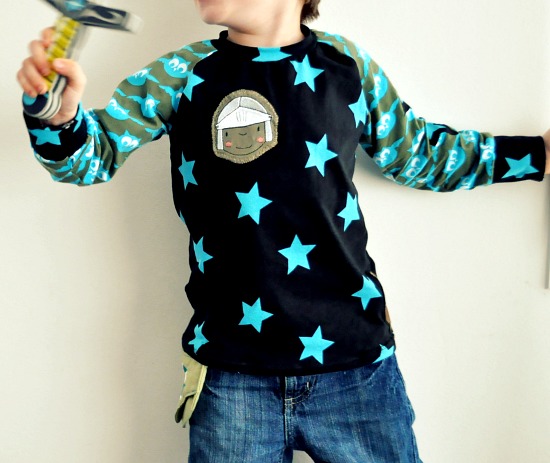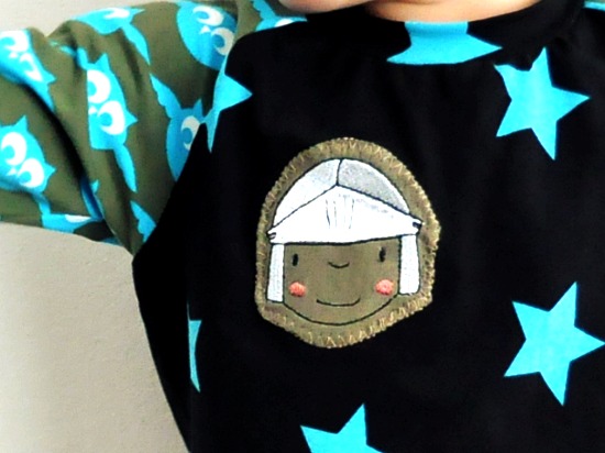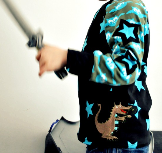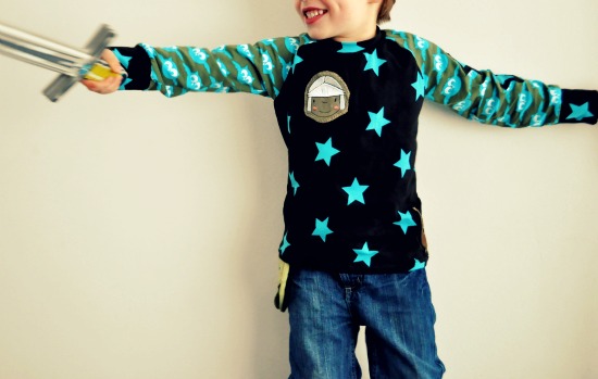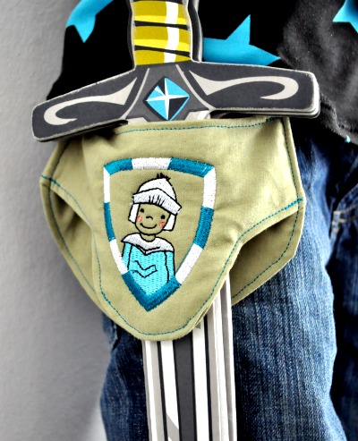 Knight Blackfoxwolf ist mighty proud of his new sword he got for Christmas. I made a sword holster using Steffi’s great tutorial and a new shirt from the new Farbenmix New Year’s Eve Special Edition bigSTARS fabric (available New Year’s Eve). A mighty good excuse to finally buy the mighty cool Knight embroidery file from Kunterbunt too!
