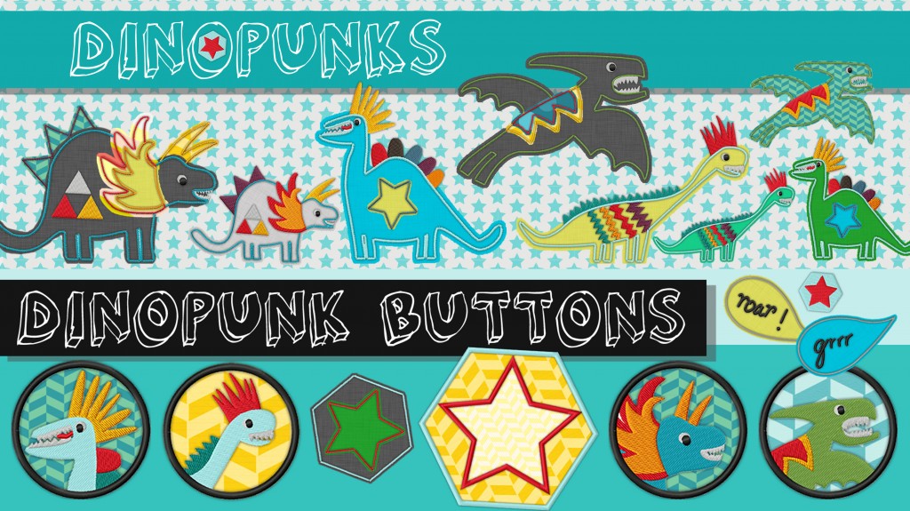 Aber fürchtet euch nicht, sie sind trotz ihres bunten Aussehens und den scharfen Zähnen dennoch ganz lieb und wollen wirklich nur spielen. Am liebsten mit Farben, wie man sieht, so haben sie sich mal in Türkis, mal in Grün oder mal in Mint bemalt und werfen mit bunten Hexagon-Sternchen wild um sich. Aber ansonsten sind sie ganz harmlos. So harmlos, dass man sie ruhigen Gewissens auf Kinderbermudas, Hemden, Shirts, oder was auch immer euch sonst noch einfällt, vernähen kann. Versprochen!
