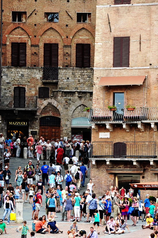 In Siena sind überall Menschen. Überall. Aber es ist nicht voll und beengt und unangenehm. Denn es sind entpsannte Menschen. Bunte Menschen. Menschen die Lachen. Menschen die sich treffen. Menschen die Pizza essen. Menschen die Erzählen. Und viele Menschen im Urlaub so wie wir. Aber auch die die nicht im Urlaub sind sondern dort leben wirken entspannt und zufrieden. Daher ist die Atmosphäre trotz der Menschenmassen sehr relaxed und selbst mit drei Kindern im Schlepptau war es nicht stressig für uns (also bis auf den normalen ich-will-ein-Eis-darf-ich-ein-Eis-ich-hab-Hunger-darf-ich-eine-Cola-kaufst-du-mir-dieses-potthäßliche-Spielzeug-oder-jenes-I-love-Italy-Shirt-ich-hab-Durst-ich-muß-Pipi-mir-ist-schlecht-wann-dürfen-wir-endlich-wieder-an-den-Pool-Stress).