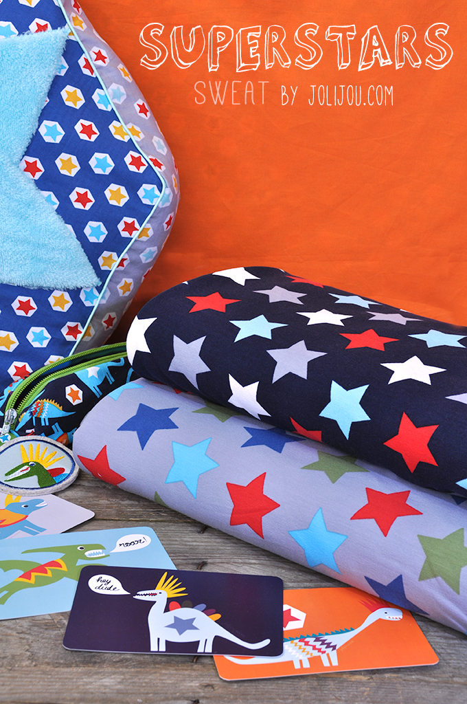 The Dinopunks collection is completed by these two cool sweatshirt designs. I really love the high quality of the fabric and you’ll find it to be super cuddly on the skin with its furry napped inside. I can see it on hoodies, sweatpants, baby overalls, sweatshirts and lots lots more. I am actually working on a pair of sweatpants for the whole (well nearly!) family as we speak. Superstars are also available on 14. July via Swafing.