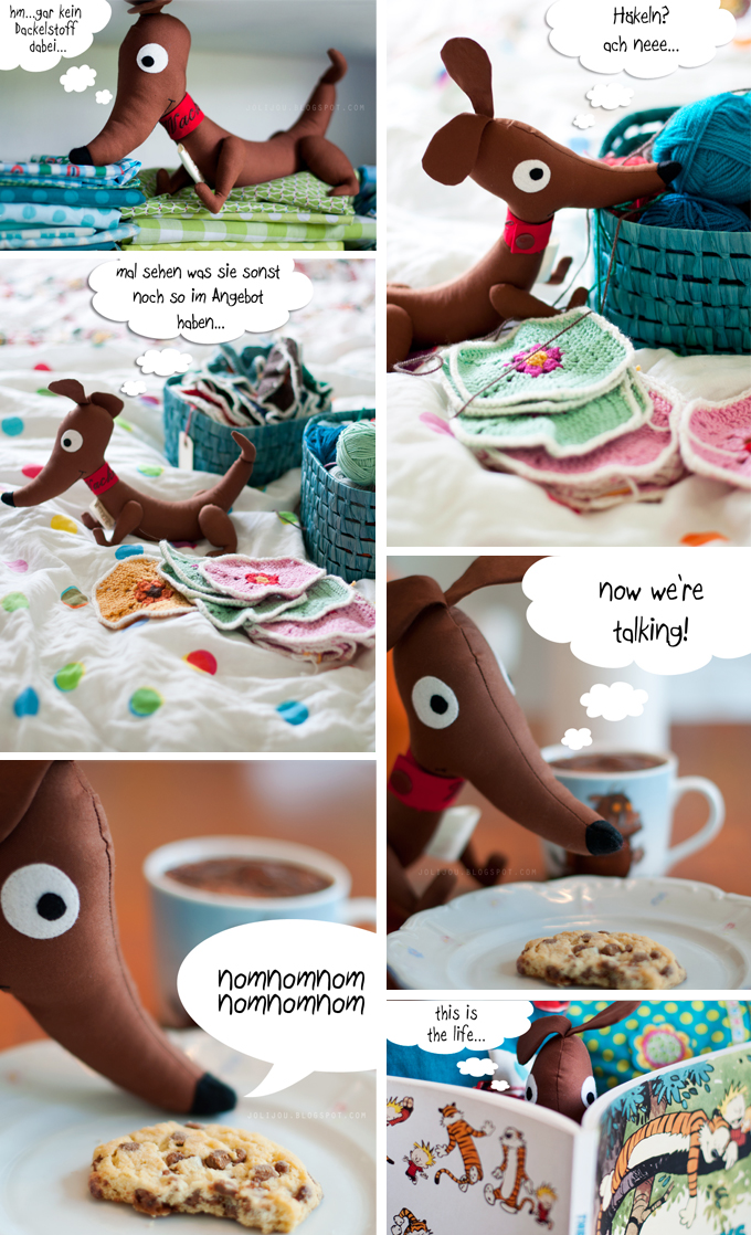 Eigentlich dachte ich, ich kann ihn ein bißchen zum Arbeiten in meinem Atelier einteilen, aber Wackel hatte andere Pläne. Er meinte, er sei ja schliesslich im Urlaub und dass, das Reisen an sich ja schon sehr anstrengend sei und man sich daher ruhig mal eine Auszeit gönnen könnte. Und so las er sich durch die komplette Comicsammlung und vernichtete alle Vorräte an Schokoladenkekse. Es sei ihm gegönnt!