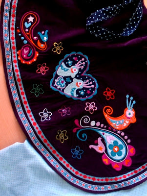 Auf diesem Kleid habe ich mich mit meiner neuen Stickdatei Alpengezwitscher – seit Donnerstag bei Huups erhältlich – so richtig ausgetobt. Dazu noch Glitzerblümchen aus dem Farbenmix-Shop, einer Trachtenborte und das Lotzadots-Band, das passt irgendwie immer finde ich….ich mag ja gerne Understatement-Bänder, die nicht zu sehr von Allgemeingeschehen ablenken, sondern sich eher still und heimlich ins Gesamtbild fügen.