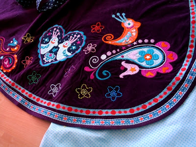 On this dress I had a parade with my new embroidery file – Alpengezwitscher – which is now available at Huups – it’s so folklore, and for even more folklore I added colourful rhinestone flowers from the Farbenmix-Shop, some traditional trimming and my lotsadotz ribbon, which I must admit, I use ALL the time, I just love understatement ribbons that rather underline a garment’s character rather than distract.