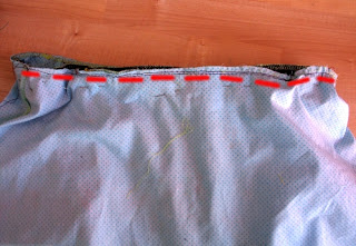 3. Nun stellt man an seiner Nähmaschine die Stichlänge auf die maximale Größe und steppt die Oberkante des Rockes jeweils jede Seite einzeln von Seitennaht zu Seitennaht. Die Anfangs- und Endfäden möglichst lang lassen, da man diese gleich zum raffen braucht.