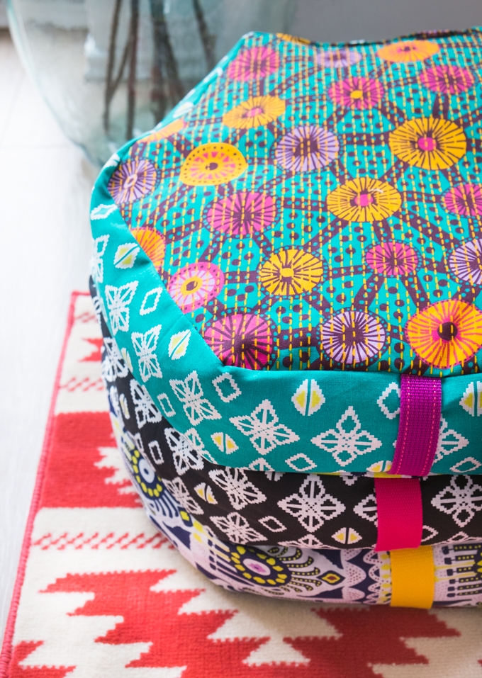 Die Stoffe trudelten also nach meiner Reise ein und als ich sie auspackte wusste ich sofort was ich daraus nähen wollte. Bunte Yogakissen. War ich doch immer noch nachhaltig von meinen morgendlichen Yoga-Sessions in der aufsteigenden Hitze der frühen Morgenstunden bei fröhlichem Vogelgezwitscher beeindruckt.